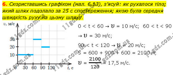Скориставшись графіком (мал. 6.13), з’ясуй: як рухалося тіло; який шлях подолало за 25 с спостереження; якою була середня швидкість руху на цьому шляху. 0 < t < 60 → υ = 10 м/с; 60 < t < 90 → υ = 30 м/с; 90 < t < 120 → υ = 20 м/с; S = 600 + 900 + 600 = 2100 м; υ = 2100/120 = 17,5 м/с.