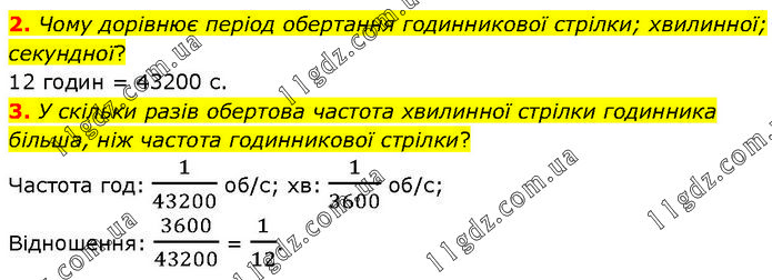 2. Чому дорівнює період обертання годинникової стрілки; хвилинної; секундної? 12 годин = 43200 с. 3. У скільки разів обертова частота хвилинної стрілки годинника більша, ніж частота годинникової стрілки? Частота год: 1/43200 об/с; хв: 1/3600 об/с; Відношення: 3600/43200 = 1/12.
