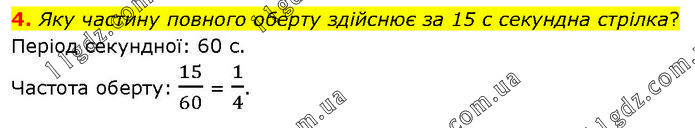 Яку частину повного оберту здійснює за 15 с секундна стрілка? Період секундної: 60 с. Частота оберту: 15/60 = 1/4.