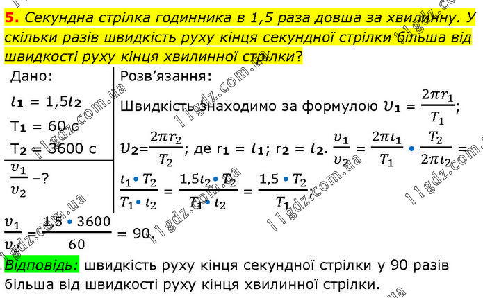 Секундна стрілка годинника в 1,5 раза довша за хвилинну. У скільки разів швидкість руху кінця секундної стрілки більша від швидкості руху кінця хвилинної стрілки? Дано: ι1 = 1,5ι2 T1 = 60 с Т2 = 3600 с Розв’язання: Швидкість знаходимо за формулою υ1 = (2πr_1)/T_1 ; υ2=(2πr_2)/T_2 ; де r1 = ι1; r2 = ι2. υ_1/υ_2 = (2πι_1)/T_1 • T_2/(2πι_2 ) = (ι_1• T_2)/(T_1• ι_2 ) = (〖1,5ι〗_2• T_2)/(T_1• ι_2 ) = (1,5 • T_2)/T_1 ; υ_1/υ_2 –? υ_1/υ_2 = (1,5 • 3600)/60 = 90. Відповідь: швидкість руху кінця секундної стрілки у 90 разів більша від швидкості руху кінця хвилинної стрілки.