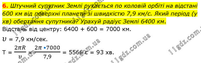 Штучний супутник Землі рухається по коловій орбіті на відстані 600 км від поверхні планети зі швидкістю 7,9 км/с. Який період (у хв) обертання супутника? Урахуй радіус Землі 6400 км. Відстань від центру: 6400 + 600 = 7000 км. υ = 7,9 км/сек. Т = 2πR/υ = (2π •7000)/7,9 = 5566 c = 93 хв.