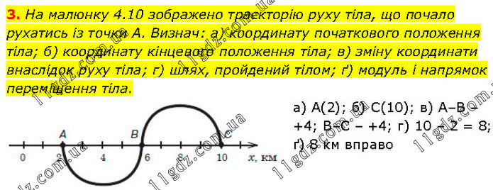 На малюнку 4.10 зображено траєкторію руху тіла, що почало рухатись із точки А. Визнач: а) координату початкового положення тіла; б) координату кінцевого положення тіла; в) зміну координати внаслідок руху тіла; г) шлях, пройдений тілом; ґ) модуль і напрямок переміщення тіла. а) А(2); б) С(10); в) А–В – +4; В–С – +4; г) 10 – 2 = 8; ґ) 8 км вправо