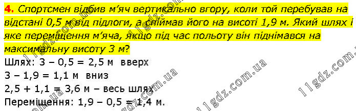 Спортсмен відбив м’яч вертикально вгору, коли той перебував на відстані 0,5 м від підлоги, а спіймав його на висоті 1,9 м. Який шлях і яке переміщення м’яча, якщо під час польоту він піднімався на максимальну висоту 3 м? Шлях: 3 – 0,5 = 2,5 м вверх 3 – 1,9 = 1,1 м вниз 2,5 + 1,1 = 3,6 м – весь шлях Переміщення: 1,9 – 0,5 = 1,4 м.