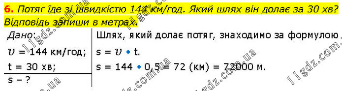 Потяг їде зі швидкістю 144 км/год. Який шлях він долає за 30 хв? Відповідь запиши в метрах. Дано: υ = 144 км/год; t = 30 хв; Шлях, який долає потяг, знаходимо за формулою s = υ • t. s = 144 • 0,5 = 72 (км) = 72000 м. s – ?