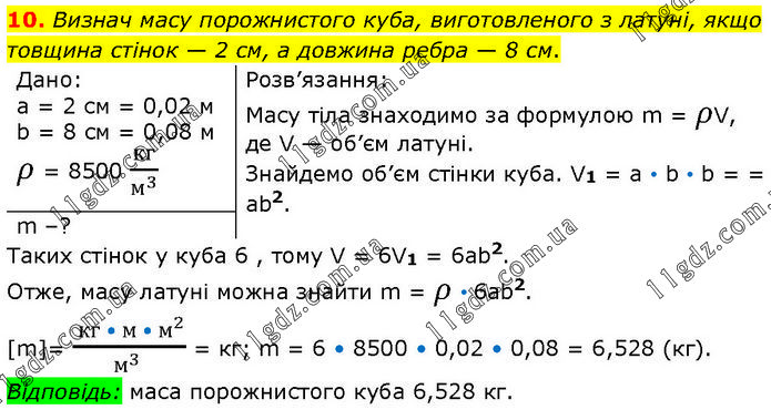 Визнач масу порожнистого куба, виготовленого з латуні, якщо товщина стінок — 2 см, а довжина ребра — 8 см. Дано: а = 2 см = 0,02 м b = 8 см = 0,08 м ρ = 8500 кг/м^3 Розв’язання: Масу тіла знаходимо за формулою m = ρV, де V — об’єм латуні. Знайдемо об’єм стінки куба. V1 = а • b • b = = аb2. m –? Таких стінок у куба 6 , тому V = 6V1 = 6аb2. Отже, масу латуні можна знайти m = ρ • 6аb2. [m]= ( кг • м • м^2)/м^(3 ) = кг; m = 6 • 8500 • 0,02 • 0,08 = 6,528 (кг). Відповідь: маса порожнистого куба 6,528 кг.