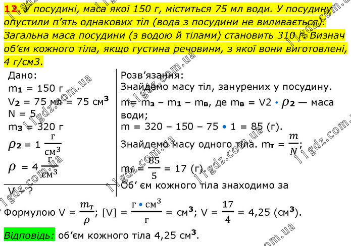 У посудині, маса якої 150 г, міститься 75 мл води. У посудину опустили п’ять однакових тіл (вода з посудини не виливається). Загальна маса посудини (з водою й тілами) становить 310 г. Визнач об’єм кожного тіла, якщо густина речовини, з якої вони виготовлені, 4 г/см3. Дано: m1 = 150 г V2 = 75 мл = 75 см3 N = 5 m3 = 320 г ρ2 = 1 г/〖см〗^3 ρ = 4 г/〖см〗^3 Розв’язання: Знайдемо масу тіл, занурених у посудину. m= mз – m1 – mв, де mв = V2 • ρ2 — маса води; m = 320 – 150 – 75 • 1 = 85 (г). Знайдемо масу одного тіла. mт = m/N; mт = 85/5 = 17 (г). Об’ єм кожного тіла знаходимо за V – ? Формулою V = m_т/ρ; [V] = (г • 〖см〗^3)/г = см3; V = 17/4 = 4,25 (см3). Відповідь: об’єм кожного тіла 4,25 см3.