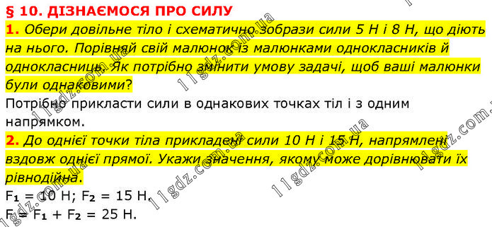 § 10. ДІЗНАЄМОСЯ ПРО СИЛУ 1. Обери довільне тіло і схематично зобрази сили 5 Н і 8 Н, що діють на нього. Порівняй свій малюнок із малюнками однокласників й однокласниць. Як потрібно змінити умову задачі, щоб ваші малюнки були однаковими? Потрібно прикласти сили в однакових точках тіл і з одним напрямком. 2. До однієї точки тіла прикладені сили 10 Н і 15 Н, напрямлені вздовж однієї прямої. Укажи значення, якому може дорівнювати їх рівнодійна. F1 = 10 H; F2 = 15 H. F = F1 + F2 = 25 H.