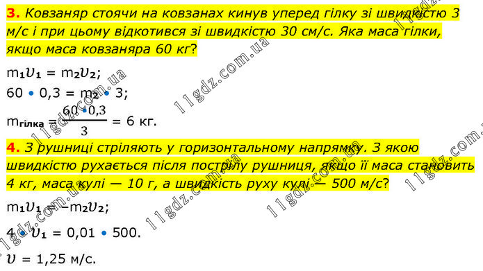 3. Ковзаняр стоячи на ковзанах кинув уперед гілку зі швидкістю 3 м/с і при цьому відкотився зі швидкістю 30 см/с. Яка маса гілки, якщо маса ковзаняра 60 кг? m1υ1 = m2υ2; 60 • 0,3 = m2 • 3; mгілка = (60 •0,3)/3 = 6 кг. 4. З рушниці стріляють у горизонтальному напрямку. З якою швидкістю рухається після пострілу рушниця, якщо її маса становить 4 кг, маса кулі — 10 г, а швидкість руху кулі — 500 м/с? m1υ1 = –m2υ2; 4 • υ1 = 0,01 • 500. υ = 1,25 м/с.