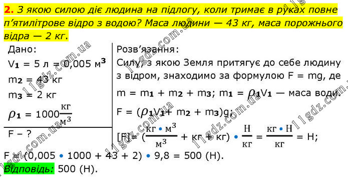 З якою силою діє людина на підлогу, коли тримає в руках повне п’ятилітрове відро з водою? Маса людини — 43 кг, маса порожнього відра — 2 кг. Дано: V1 = 5 л = 0,005 м3 m2 = 43 кг m3 = 2 кг ρ1 = 1000кг/м^3 Розв’язання: Силу, з якою Земля притягує до себе людину з відром, знаходимо за формулою F = mg, де m = m1 + m2 + m3; m1 = ρ1V1 — маса води. F = (ρ1V1+ m2 + m3)g; [F]= ((кг • м^3)/м^3 + кг + кг) • Н/кг = (кг • Н)/кг = Н; F – ? F = (0,005 • 1000 + 43 + 2) • 9,8 = 500 (Н). Відповідь: 500 (Н).