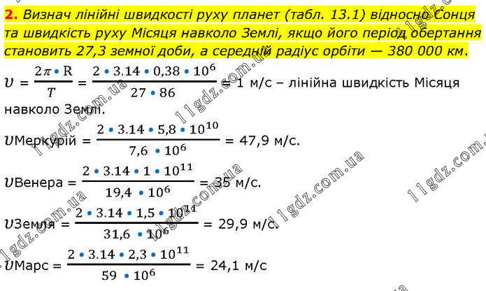 Визнач лінійні швидкості руху планет (табл. 13.1) відносно Сонця та швидкість руху Місяця навколо Землі, якщо його період обертання становить 27,3 земної доби, а середній радіус орбіти — 380 000 км. υ = (2 • R)/(T ) = (2 • 3.14 • 0,38 • 10^6)/(27 • 86 ) = 1 м/с – лінійна швидкість Місяця навколо Землі. υМеркурій = (2 • 3.14 • 5,8 • 10^10)/(7,6 • 10^6 ) = 47,9 м/с. υВенера = (2 • 3.14 • 1 • 10^11)/(19,4 • 10^6 ) = 35 м/с. υЗемля = (2 • 3.14 • 1,5 • 10^11)/(31,6 • 10^6 ) = 29,9 м/с. υМарс = (2 • 3.14 • 2,3 • 10^11)/(59 • 10^6 ) = 24,1 м/с
