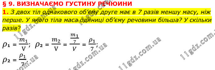 § 9. ВИЗНАЧАЄМО ГУСТИНУ РЕЧЮИНИ 1. З двох тіл однакового об’єму друге має в 7 разів меншу масу, ніж перше. У якого тіла маса одиниці об’єму речовини більша? У скільки разів? ρ1 = m_1/V; ρ2 = m_2/V = (m_1/7)/V = ρ_1/7; ρ2 = ρ_1/7.