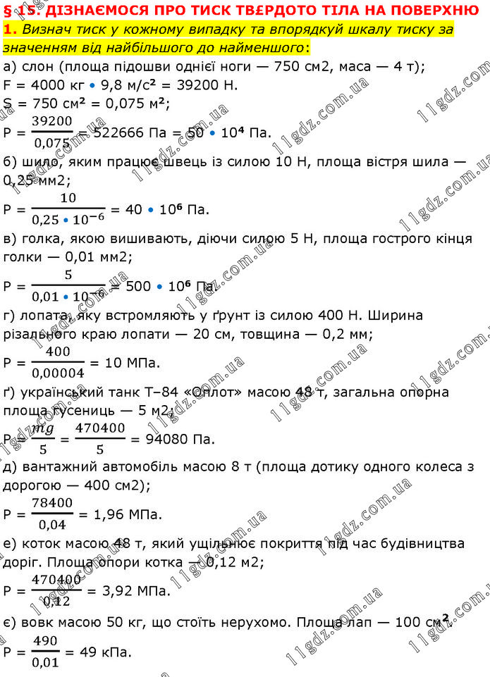 § 15. ДІЗНАЄМОСЯ ПРО ТИСК ТВ£РДОТО ТІЛА НА ПОВЕРХНЮ 1. Визнач тиск у кожному випадку та впорядкуй шкалу тиску за значенням від найбільшого до найменшого: а) слон (площа підошви однієї ноги — 750 см2, маса — 4 т); F = 4000 кг • 9,8 м/с2 = 39200 Н. S = 750 cм2 = 0,075 м2; Р = 39200/0,075 = 522666 Па = 50 • 104 Па. б) шило, яким працює швець із силою 10 Н, площа вістря шила — 0,25 мм2; Р = 10/(0,25 • 10^(-6) ) = 40 • 106 Па. в) голка, якою вишивають, діючи силою 5 Н, площа гострого кінця голки — 0,01 мм2; Р = 5/(0,01 • 10^(-6) ) = 500 • 106 Па. г) лопата, яку встромляють у ґрунт із силою 400 Н. Ширина різального краю лопати — 20 см, товщина — 0,2 мм; Р = 400/0,00004 = 10 МПа. ґ) український танк Т–84 «Оплот» масою 48 т, загальна опорна площа гусениць — 5 м2; Р = mg/5 = 470400/5 = 94080 Па. д) вантажний автомобіль масою 8 т (площа дотику одного колеса з дорогою — 400 см2); Р = 78400/0,04 = 1,96 МПа. е) коток масою 48 т, який ущільнює покриття під час будівництва доріг. Площа опори котка — 0,12 м2; Р = 470400/0,12 = 3,92 МПа. є) вовк масою 50 кг, що стоїть нерухомо. Площа лап — 100 см2. Р = 490/0,01 = 49 кПа.