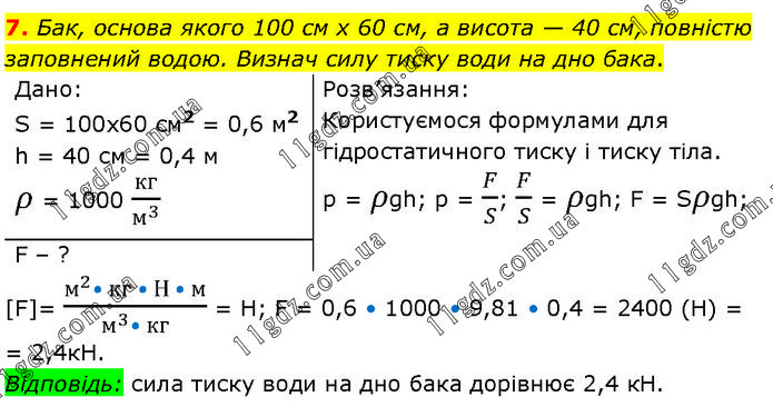 Бак, основа якого 100 см х 60 см, а висота — 40 см, повністю заповнений водою. Визнач силу тиску води на дно бака. Дано: S = 100x60 см2 = 0,6 м2 h = 40 см = 0,4 м ρ = 1000 кг/м^3 Розв’язання: Користуємося формулами для гідростатичного тиску і тиску тіла. р = ρgh; p = F/S; F/S = ρgh; F = Sρgh; F – ? [F]= (м^2• кг • Н • м)/(м^3• кг) = Н; F = 0,6 • 1000 • 9,81 • 0,4 = 2400 (Н) = = 2,4кН. Відповідь: сила тиску води на дно бака дорівнює 2,4 кН.