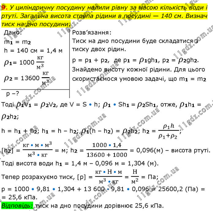 У циліндричну посудину налили рівну за масою кількість води і ртуті. Загальна висота стовпа рідини в посудині — 140 см. Визнач тиск на дно посудини. Дано: m1 = m2 h = 140 см = 1,4 м ρ1= 1000 кг/м^3 ρ2 = 13600 кг/м^3 Розв’язання: Тиск на дно посудини буде складатися з тиску двох рідин. p = p1 + p2, де p1 = ρ1gh1, p2 = ρ2gh2. Знайдемо висоту кожної рідини. Для цього скористаємося умовою задачі, що m1 = m2 p –? Тоді ρ1V1 = ρ2V2, де V = S • h; ρ1 • Sh1 = ρ2Sh1, отже, ρ1h1 = ρ2h2; h = h1 + h2; h1 = h – h2; ρ1(h – h2) = ρ2h2; h2 = (ρ_1 h)/(ρ_1+ρ_2 ); [h2] = (кг • м • м^3)/(м^3 • кг) = м; h2 = (1000 • 1,4)/(13600 + 1000) = 0,096(м) – висота ртуті. Тоді висота води h1 = 1,4 м – 0,096 м = 1,304 (м). Тепер розрахуємо тиск, [р] = (кг • H • м)/(м^3 • кг) = H/м^2 = Па; р = 1000 • 9,81 • 1,304 + 13 600 • 9,81 • 0,096 = 25600,2 (Па) = = 25,6 кПа. Відповідь: тиск на дно посудини дорівнює 25,6 кПа.