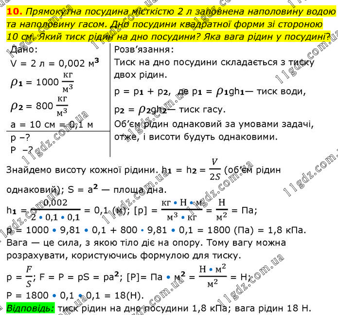 Прямокутна посудина місткістю 2 л заповнена наполовину водою та наполовину гасом. Дно посудини квадратної форми зі стороною 10 см. Який тиск рідин на дно посудини? Яка вага рідин у посудині? Дано: V = 2 л = 0,002 м3 ρ1 = 1000 кг/м^3 ρ2 = 800 кг/м^3 а = 10 см = 0,1 м Розв’язання: Тиск на дно посудини складається з тиску двох рідин. p = p1 + p2, де p1 = ρ1gh1— тиск води, p2 = ρ2gh2— тиск гасу. Об’єм рідин однаковий за умовами задачі, отже, і висоти будуть однаковими. p –? P –? Знайдемо висоту кожної рідини. h1 = h2 = V/2S (об’єм рідин однаковий); S = а2 — площа дна. h1 = 0,002/(2 • 0,1 • 0,1) = 0,1 (м); [p] = (кг • H • м)/(м^3 • кг) = H/м^2 = Па; р = 1000 • 9,81 • 0,1 + 800 • 9,81 • 0,1 = 1800 (Па) = 1,8 кПа. Вага — це сила, з якою тіло діє на опору. Тому вагу можна розрахувати, користуючись формулою для тиску. p = F/S; F = P = pS = pa2; [P]= Па • м2 = (H • м^2)/м^2 = H; P = 1800 • 0,1 • 0,1 = 18(H). Відповідь: тиск рідин на дно посудини 1,8 кПа; вага рідин 18 Н.
