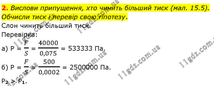 Вислови припущення, хто чинить більший тиск (мал. 15.5). Обчисли тиск і перевір свою гіпотезу. Слон чинить більший тиск. Перевірка: а) Р = F/S = 40000/0,075 = 533333 Па. б) Р = F/S = 500/0,0002 = 2500000 Па. P2 > P1.