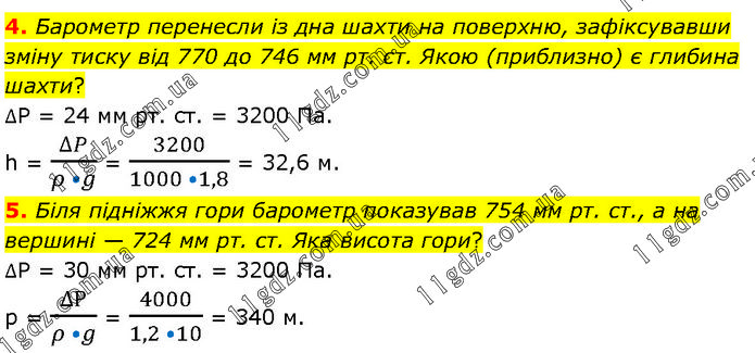 4. Барометр перенесли із дна шахти на поверхню, зафіксувавши зміну тиску від 770 до 746 мм рт. ст. Якою (приблизно) є глибина шахти? ∆Р = 24 мм рт. ст. = 3200 Па. h = ∆P/(ρ •g) = 3200/(1000 •1,8) = 32,6 м. 5. Біля підніжжя гори барометр показував 754 мм рт. ст., а на вершині — 724 мм рт. ст. Яка висота гори? ∆Р = 30 мм рт. ст. = 3200 Па. р = ∆Р/(ρ •g) = 4000/(1,2 •10) = 340 м.