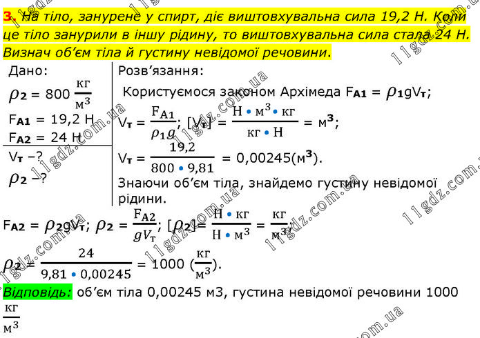 На тіло, занурене у спирт, діє виштовхувальна сила 19,2 Н. Коли це тіло занурили в іншу рідину, то виштовхувальна сила стала 24 Н. Визнач об’єм тіла й густину невідомої речовини. Дано: ρ2 = 800 кг/м^3 FA1 = 19,2 H FA2 = 24 H Розв’язання: Користуємося законом Архімеда FA1 = ρ1gVт; Vт = F_A1/(ρ_1 g); [Vт] = (H • м^3• кг )/(кг • H) = м3; Vт = 19,2/(800 • 9,81) = 0,00245(м3). Знаючи об’єм тіла, знайдемо густину невідомої рідини. Vт –? ρ2 –? FA2 = ρ2gVт; ρ2 = F_A2/(gV_т ); [ρ2]= (Н • кг)/(Н • м^3 ) = кг/м^3 ; ρ2 = 24/(9,81 • 0,00245) = 1000 (кг/м^3 ). Відповідь: об’єм тіла 0,00245 м3, густина невідомої речовини 1000 кг/м^3