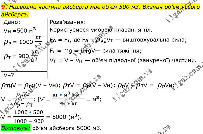 Надводна частина айсберга має об’єм 500 м3. Визнач об’єм усього айсберга. Дано: VH =500 м3 ρp = 1000 кг/м^3 ρт = 900 кг/м^3 Розв’язання: Користуємося умовою плавання тіл. FA = Fт, де FA – ρpgVТ — виштовхувальна сила; Fт = mg = ρТgV— сила тяжіння; VТ = V – VH — об’єм підводної (зануреної) частини. V–? ρТgV = ρpg(V – VH); ρТV = ρp(V – VH); ρpV – ρТV = ρpVH; V = (ρ_p V_H)/(ρ_p- ρ_Т ); [V]= (кг • м^3 • м^3 )/(м^3 • кг) = м3; V = (1000 • 500)/(1000 - 900) = 5000 (м3). Відповідь: об’єм айсберга 5000 м3.