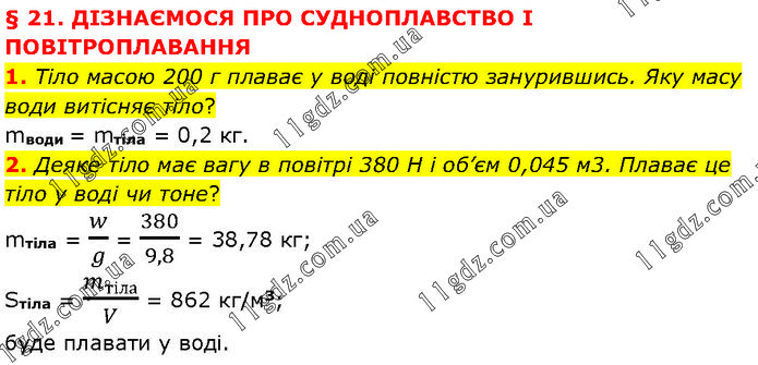 § 21. ДІЗНАЄМОСЯ ПРО СУДНОПЛАВСТВО І ПОВІТРОПЛАВАННЯ 1. Тіло масою 200 г плаває у воді повністю занурившись. Яку масу води витісняє тіло? mводи = mтіла = 0,2 кг. 2. Деяке тіло має вагу в повітрі 380 Н і об’єм 0,045 м3. Плаває це тіло у воді чи тоне? mтіла = w/g = 380/9,8 = 38,78 кг; Sтіла = m_тіла/V = 862 кг/м3; буде плавати у воді.