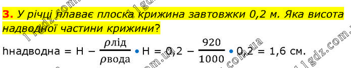 У річці плаває плоска крижина завтовжки 0,2 м. Яка висота надводної частини крижини? hнадводна = H − ρлід/ρвода • H = 0,2 − 920/1000 • 0,2 = 1,6 см.