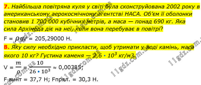 7. Найбільша повітряна куля у світі була сконструйована 2002 року в американському аерокосмічному агентстві НАСА. Об’єм її оболонки становив 1 700 000 кубічних метрів, а маса — понад 690 кг. Яка сила Архімеда діє на неї, коли вона перебуває в повітрі? F = ρgV = 205,29000 H. 8. Яку силу необхідно прикласти, щоб утримати у воді камінь, маса якого 10 кг? Густина каменя — 2,6 • 103 кг/м3. V = m/ρ = 10/(26 • 10^3 ) ≈ 0,00385; F винт = 37,7 H; Fпрял. = 30,3 Н.