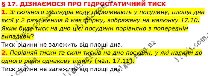 § 17. ДІЗНАЄМОСЯ ПРО ГІДРОСТАТИЧНИЙ ТИСК 1. Зі скляного циліндра воду переливають у посудину, площа дна якої у 2 рази менша й має форму, зображену на малюнку 17.10. Яким буде тиск на дно цієї посудини порівняно з попереднім випадком? Тиск рідини не залежить від площі дна. 2. Порівняй тиски та сили тисків на дно посудин, у які налили до одного рівня однакову рідину (мал. 17.11). Тиск рідини не залежить від площі дна.