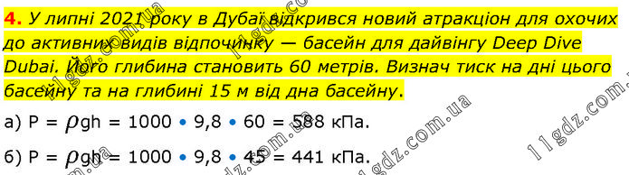 У липні 2021 року в Дубаї відкрився новий атракціон для охочих до активних видів відпочинку — басейн для дайвінгу Deep Dive Dubai. Його глибина становить 60 метрів. Визнач тиск на дні цього басейну та на глибині 15 м від дна басейну. а) Р = ρgh = 1000 • 9,8 • 60 = 588 кПа. б) Р = ρgh = 1000 • 9,8 • 45 = 441 кПа.