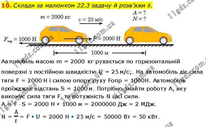 Склади за малюнком 22.3 задачу й розв’яжи її. Автомобіль масою m = 2000 кг рухається по горизонтальній поверхні з постійною швидкістю υ = 25 м/с. На автомобіль діє сила тяги F = 2000 Н і силою опору руху Fопр = 1000Н. Автомобіль проїжджає відстань S = 1000 м. Потрібно знайти роботу A, яку виконує сила тяги F, та потужність N цієї сили. A = F ⋅ S = 2000 Н • 1000 м = 2000000 Дж = 2 МДж. N = А/t = F • υ = 2000 Н • 25 м/с = 50000 Вт = 50 кВт.