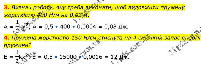 3. Визнач роботу, яку треба виконати, щоб видовжити пружину жорсткістю 400 Н/м на 0,02 м. A = 1/2kx2; A = 0,5 • 400 • 0,0004 = 0,08 Дж. 4. Пружина жорсткістю 150 Н/см стиснута на 4 см. Який запас енергії пружини? Е = 1/2kx2; E = 0,5 • 15000 • 0,0016 = 12 Дж.