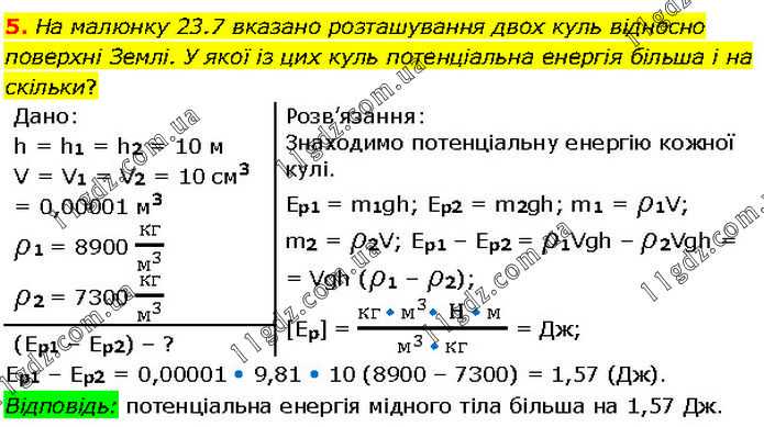 На малюнку 23.7 вказано розташування двох куль відносно поверхні Землі. У якої із цих куль потенціальна енергія більша і на скільки? Дано: h = h1 = h2 = 10 м; V = V1 = V2 = 10 см3 = 0,00001 м3; ρ1 = 8900 кг/м^3 ; ρ2 = 7300 кг/м^3 ; Розв’язання: Знаходимо потенціальну енергію кожної кулі. Ep1 = m1gh; Ep2 = m2gh; m1 = ρ1V; m2 = ρ2V; Ep1 – Ep2 = ρ1Vgh – ρ2Vgh = Vgh (ρ1 – ρ2); [Ep] = (кг •〖 м〗^3• H • м )/(м^3 • кг) = Дж; (Ep1 – Ep2) – ? Ep1 – Ep2 = 0,00001 • 9,81 • 10 (8900 – 7300) = 1,57 (Дж). Відповідь: потенціальна енергія мідного тіла більша на 1,57 Дж.