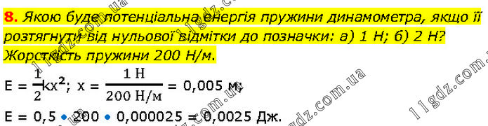 Якою буде потенціальна енергія пружини динамометра, якщо її розтягнути від нульової відмітки до позначки: а) 1 Н; б) 2 Н? Жорсткість пружини 200 Н/м. Е = 1/2kx2; x = (1 Н)/(200 Н/м) = 0,005 м; E = 0,5 • 200 • 0,000025 = 0,0025 Дж.