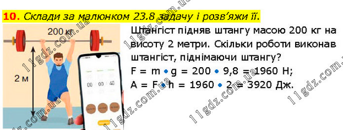 Склади за малюнком 23.8 задачу і розв’яжи її. Штангіст підняв штангу масою 200 кг на висоту 2 метри. Скільки роботи виконав штангіст, піднімаючи штангу? F = m • g = 200 • 9,8 = 1960 H; A = F • h = 1960 • 2 = 3920 Дж.