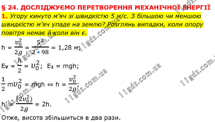 § 24. ДОСЛІДЖУЄМО ПЕРЕТВОРЕННЯ МЕХАНІЧНОЇ ЕНЕРГІЇ 1. Угору кинуто м’яч зі швидкістю 5 м/с. З більшою чи меншою швидкістю м’яч упаде на землю? Розглянь випадки, коли опору повітря немає й коли він є. h = (υ_0^2)/2g = 5^2/(2 • 98) = 1,28 м; EV = h/2 = υ_0^2; E1 = mgh; 1/2 mυ_0^2 = mgh ⇔ h = (υ_0^2)/2g; h’ = (〖(2υ〗_0^2))/2g = 2h. Отже, висота збільшиться в два рази.