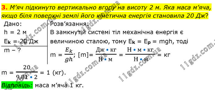 М’яч підкинуто вертикально вгору на висоту 2 м. Яка маса м’яча, якщо біля поверхні землі його кінетична енергія становила 20 Дж? Дано: h = 2 м; Ek = 20 Дж. Розв’язання: В замкнутій системі тіл механічна енергія є величиною сталою, тому Ek = Ep = mgh, тодi m = E_k/gh; [m]= (Дж • кг)/(Н • м ) = ( H • м • кг )/( H • м) = кг. m – ? m = 20/(9,81 • 2) = 1 (кг). Відповідь: маса м’яча 1 кг.