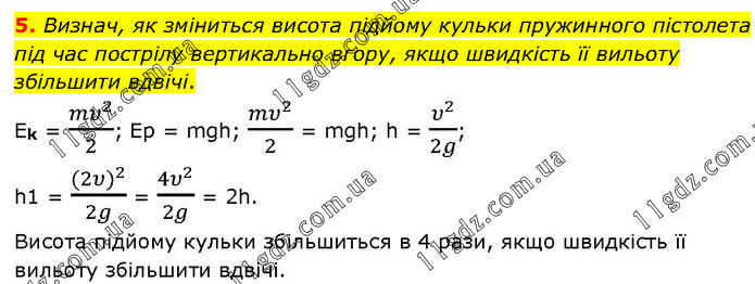 Визнач, як зміниться висота підйому кульки пружинного пістолета під час пострілу вертикально вгору, якщо швидкість її вильоту збільшити вдвічі. Ek = (mυ^2)/2; Ep = mgh; (mυ^2)/2 = mgh; h = υ^2/2g; h1 = 〖(2υ)〗^2/2g = 〖4υ〗^2/2g = 2h. Висота підйому кульки збільшиться в 4 рази, якщо швидкість її вильоту збільшити вдвічі.