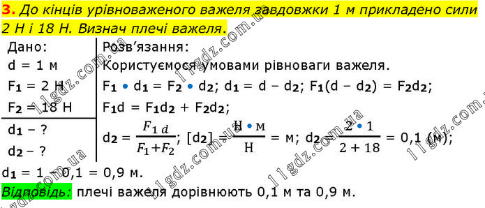До кінців урівноваженого важеля завдовжки 1 м прикладено сили 2 Н і 18 Н. Визнач плечі важеля. Дано: d = 1 м; F1 = 2 Н; F2 = 18 Н. Розв’язання: Користуємося умовами рівноваги важеля. F1 • d1 = F2 • d2; d1 = d – d2; F1(d – d2) = F2d2; F1d = F1d2 + F2d2; d2 = F_1d/(F_1 + F_2 ); [d2] = (Н • м)/H = м; d2 = (2 • 1)/(2 + 18) = 0,1 (м); d1 – ?, d2 – ? d1 = 1 – 0,1 = 0,9 м. Відповідь: плечі важеля дорівнюють 0,1 м та 0,9 м.