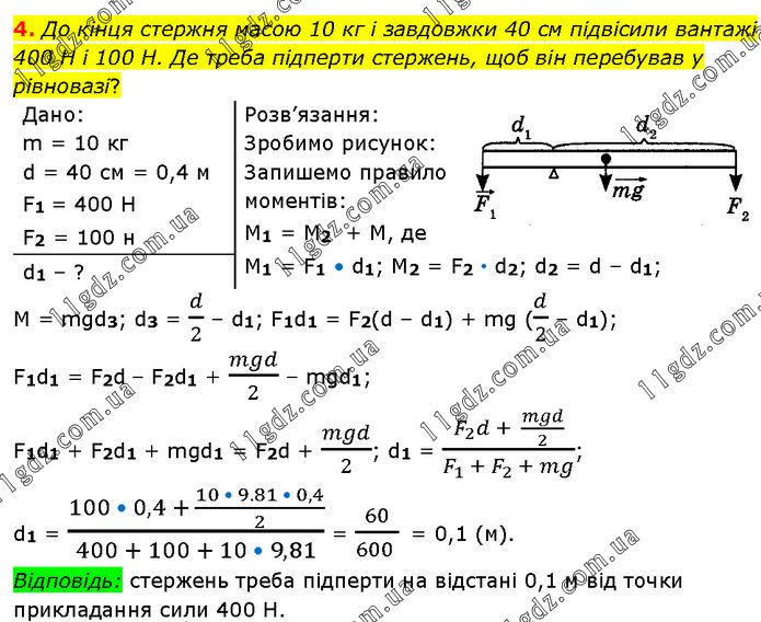 До кінця стержня масою 10 кг і завдовжки 40 см підвісили вантажі 400 Н і 100 Н. Де треба підперти стержень, щоб він перебував у рівновазі? Дано: m = 10 кг; d = 40 см = 0,4 м; F1 = 400 Н; F2 = 100 Н. Розв’язання: Зробимо рисунок: Запишемо правило моментів: М1 = М2 + М, де М1 = F1 • d1; М2 = F2 • d2; d2 = d – d1; d1 – ? M = mgd3; d3 = d/2 – d1; F1d1 = F2(d – d1) + mg(d/2 – d1); F1d1 = F2d – F2d1 + mgd/2 – mgd1; F1d1 + F2d1 + mgd1 = F2d + mgd/2; d1 = (F_2 d + mgd/2)/(F_1 + F_2 + mg); d1 = (100 • 0,4 + (10 • 9.81 • 0,4)/2)/(400 + 100 + 10 • 9,81) = 60/(600 ) = 0,1 (м). Відповідь: стержень треба підперти на відстані 0,1 м від точки прикладання сили 400 Н.