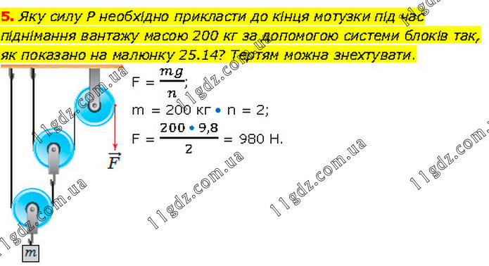 Яку силу Р необхідно прикласти до кінця мотузки під час піднімання вантажу масою 200 кг за допомогою системи блоків так, як показано на малюнку 25.14? Тертям можна знехтувати. F = mg/n; m = 200 кг • n = 2; F = (200 • 9,8)/2 = 980 H.