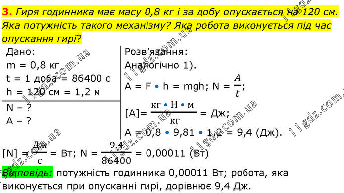 Гиря годинника має масу 0,8 кг і за добу опускається на 120 см. Яка потужність такого механізму? Яка робота виконується під час опускання гирі? Дано: m = 0,8 кг; t = 1 доба = 86400 с; h = 120 см = 1,2 м. Розв’язання: Аналогічно 1). А = F • h = mgh; N = A/t; [A]= (кг • H • м )/( кг) = Дж; А = 0,8 • 9,81 • 1,2 = 9,4 (Дж). N – ?, A – ? [N] = Дж/с = Вт; N = 9,4/86400 = 0,00011 (Вт) Відповідь: потужність годинника 0,00011 Вт; робота, яка виконується при опусканні гирі, дорівнює 9,4 Дж.