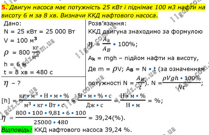 Двигун насоса має потужність 25 кВт і піднімає 100 м3 нафти на висоту 6 м за 8 хв. Визначи ККД нафтового насоса. Дано: N = 25 кВт = 25 000 Вт; V = 100 м3; ρ = 800 кг/м^3 ; h = 6 м; t = 8 хв = 480 с. Розв’язання: ККД двигуна знаходимо за формулою η = A_k/A_B • 100%; Ak = mgh – підйом нафти на висоту, де m = ρV; AB = N • t (за означенням потужності N = A_B/t). N = (ρVgh • 100%)/Nt; η – ? [η] = (кг • м^3 • Н • м • %)/(м^3 • кг • Вт • с) = (Н • м • % • с)/(Дж • с) = (Н • м • %)/(Н • м) = %; η = (800 • 100 • 9,81 • 6 • 100)/(25000 • 480) = 39,24(%). Відповідь: ККД нафтового насоса 39,24 %.