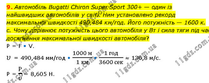 Автомобіль Bugatti Chiron Super Sport 300+ — один із найшвидших автомобілів у світі. Ним установлено рекорд максимальної швидкості 490,484 км/год. Його потужність — 1600 к. с. Чому дорівнює потужність цього автомобіля у Вт і сила тяги під час досягнення максимальної швидкості автомобіля? P = F • V. υ = 490,484 мм/год • (1000 м)/(1 км) • (1 год)/(3600 сек) ≈ 136,8 м/с. Р = Р/υ = 8,605 Н.
