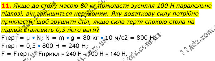 Якщо до столу масою 80 кг прикласти зусилля 100 Н паралельно підлозі, він залишиться нерухомим. Яку додаткову силу потрібно прикласти, щоб зрушити стіл, якщо сила тертя спокою стола на підлозі становить 0,3 його ваги? Fтерт = μ • N; N = m • g = 80 кг • 10 м/с2 = 800 Н; Fтерт = 0,3 • 800 Н = 240 Н; F = Fтерт − Fприкл = 240 Н – 100 Н = 140 Н.