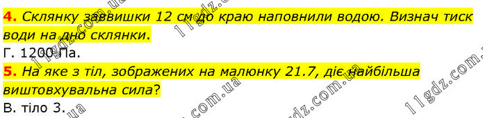4. Склянку заввишки 12 см до краю наповнили водою. Визнач тиск води на дно склянки. Г. 1200 Па. 5. На яке з тіл, зображених на малюнку 21.7, діє найбільша виштовхувальна сила? В. тіло 3.