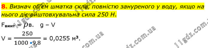 Визнач об’єм шматка скла, повністю зануреного у воду, якщо на нього діє виштовхувальна сила 250 Н. Fвинт = ρв. g – V V = 250/(1000 •9,8) = 0,0255 м3.