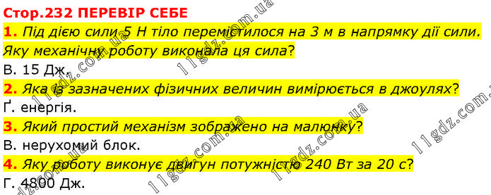 Стор.232 ПЕРЕВІР СЕБЕ 1. Під дією сили 5 Н тіло перемістилося на 3 м в напрямку дії сили. Яку механічну роботу виконала ця сила? В. 15 Дж. 2. Яка із зазначених фізичних величин вимірюється в джоулях? Ґ. енергія. 3. Який простий механізм зображено на малюнку? В. нерухомий блок. 4. Яку роботу виконує двигун потужністю 240 Вт за 20 с? Г. 4800 Дж.