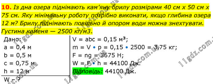 Із дна озера піднімають кам’яну брилу розмірами 40 см х 50 см х 75 см. Яку мінімальну роботу потрібно виконати, якщо глибина озера 12 м? Брилу піднімають повільно й опором води можна знехтувати. Густина каменя — 2500 кг/м3. Дано: а = 0,4 м; b = 0,5 м; с = 0,75 м; h = 12 м. V = abc = 0,15 м3; m = V • p = 0,15 • 2500 = 3,75 кг; F = ng = 3675 H; W = F • h = 44100 Дж. Відповідь: 44100 Дж. W – ?