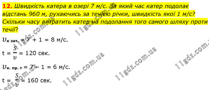 Швидкість катера в озері 7 м/с. За який час катер подолає відстань 960 м, рухаючись за течією річки, швидкість якої 1 м/с? Скільки часу витратить катер на подолання того самого шляху проти течії? υк зат. = 7 + 1 = 8 м/с. t = S/υ = 120 cек. υк. пр. т = 7 – 1 = 6 м/с. t = S/υ = 160 cек.
