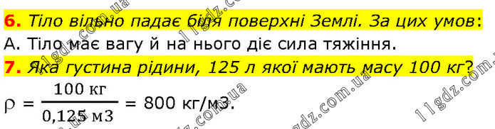 6. Тіло вільно падає біля поверхні Землі. За цих умов: А. Тіло має вагу й на нього діє сила тяжіння. 7. Яка густина рідини, 125 л якої мають масу 100 кг? ρ = (100 кг)/(0,125 м3 ) = 800 кг/м3.