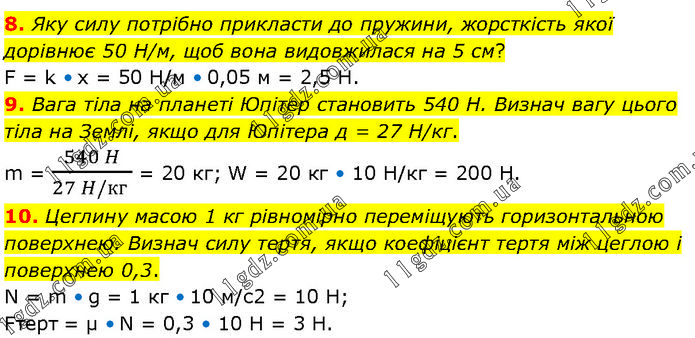8. Яку силу потрібно прикласти до пружини, жорсткість якої дорівнює 50 Н/м, щоб вона видовжилася на 5 см? F = k • x = 50 Н/м • 0,05 м = 2,5 Н. 9. Вага тіла на планеті Юпітер становить 540 Н. Визнач вагу цього тіла на Землі, якщо для Юпітера д = 27 Н/кг. m = (540 H)/(27 H/кг ) = 20 кг; W = 20 кг • 10 Н/кг = 200 Н. 10. Цеглину масою 1 кг рівномірно переміщують горизонтальною поверхнею. Визнач силу тертя, якщо коефіцієнт тертя між цеглою і поверхнею 0,3. N = m • g = 1 кг • 10 м/с2 = 10 Н; Fтерт = μ • N = 0,3 • 10 Н = 3 Н.